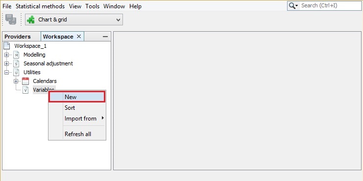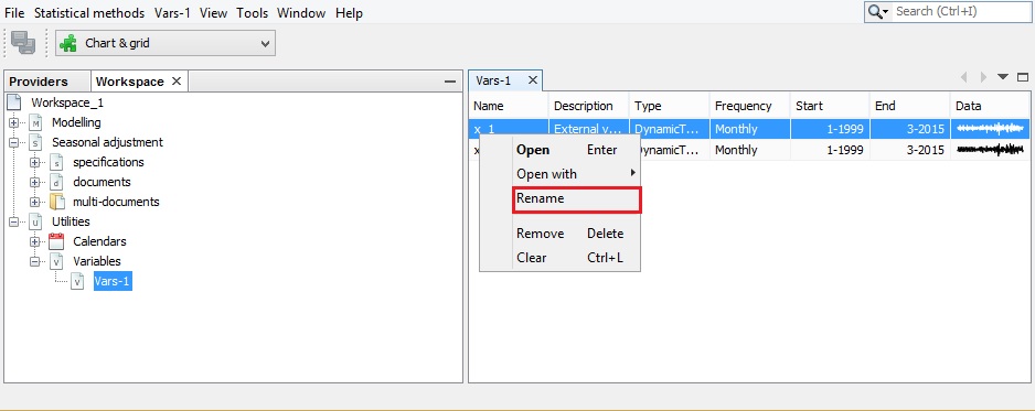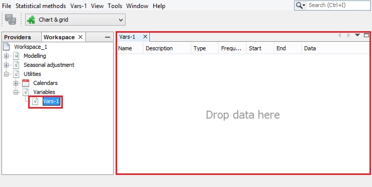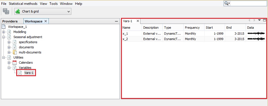 Next, double click on the newly created Vars-1 item to display it in the Results panel. By default, JDemetra+ uses the conventions Vars_#number to name the tabs under the Variables node.