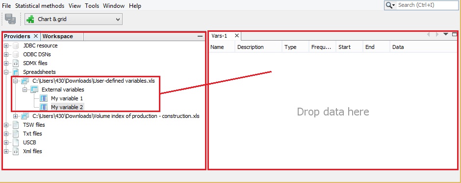 - Dynamic variables that are imported into the Variables panel by dragging and dropping series from a browser of the application, available in the Providers window. Dynamic variables are automatically updated each time the application is re-opened. Therefore, it is a convenient solution for creating user-defined variables.