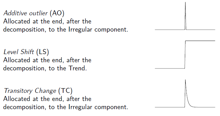 Outliers are well-defined types of auxiliary variables, therefore when they are used (Reg-ARIMA or Tramo modelling) they don’t need to be explicitly generated beforehand. Pre-specifying outliers is detailed in chapters on pre-treatment in SA and SA of High-frequency data.