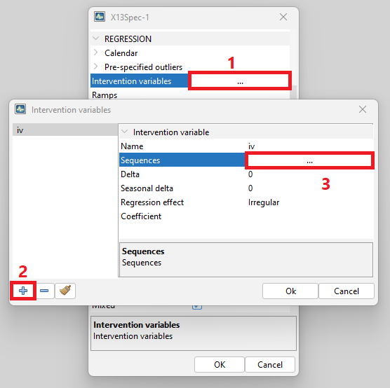 Adding intervention variables to a seasonal adjustment (or Reg-ARIMA / Tramo) specification happens in one step when using the GUI, whereas two steps are required in R: generating the regressors and the adding them as an user-defined variable.