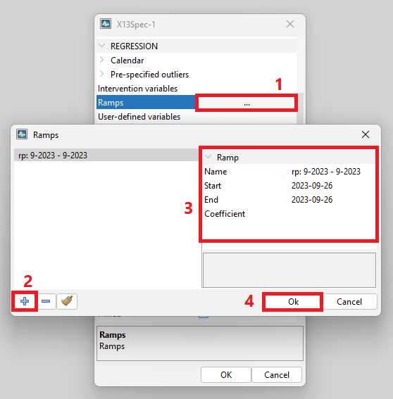 Adding ramps to a seasonal adjustment (or Reg-ARIMA / Tramo) specification happens in one step in GUI as well as in R, where ramp regressors can nevertheless be independently generated.