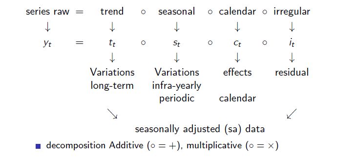 X-11 is the decomposition module of X-13-ARIMA, the linearized series from the pre-adjustment step is split into seasonal (\(S\)), trend (\(T\)) and irregular (\(I\)) components. In case of multiple periodicities the decomposition is done periodicity by periodicity starting with the smallest one. Global structure of the iterations is the same as in “classical” X-11 but modifications were introduced for tackling non-integer periodicities. They rely on the Taylor approximation for the seasonal backshift operator: