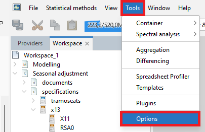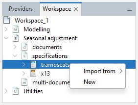 The user may add new seasonal adjustment specifications to the Workspace window. To do it, go to the Seasonal adjustment section, right click on the tramoseats or x13 item in the specifications node and select New from the local menu.