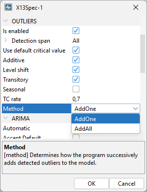 Default specifications are set for the whole SA procedure, pre-treatment and decomposition. They are slightly different for X-13-ARIMA and Tramo-Seats and can be modified with user-defined parameters.