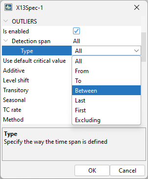 Specifies the span (data interval) of the time series to be used in the seasonal adjustment process. The user can restrict the span