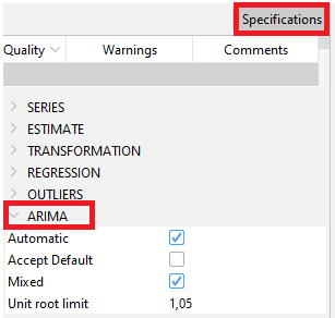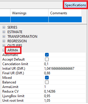 Key specifications on ARIMA modelling are embedded in default specifications: airline (default model) or full automatic research.(links)