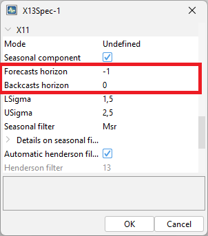(for both options) fcst.horizon the forecasting horizon (numeric). The forecast length generated by the Reg-ARIMA model in periods (positive values) or years (negative values). By default, the program generates a two-year forecast (fcst.horizon set to -2). Defaults different in GUI and R.