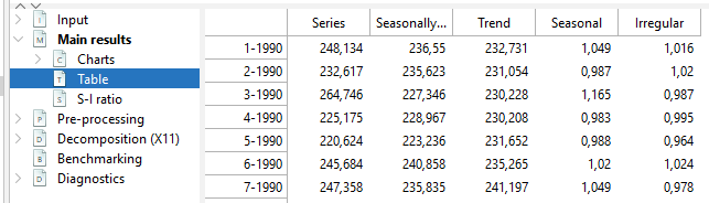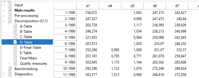 D-Table contains the final components stemming from the decomposition of the linearized series (B1 or ylin in Pre-processing > Pre-adjustment series node )