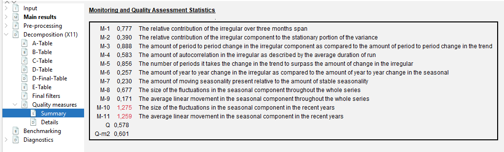 X11 algorithm provides quality measures of the decomposition called “M statistics” (detailed here