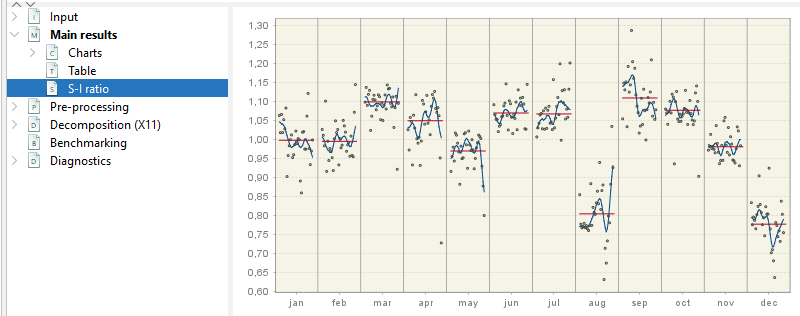 For each period (month, quarter) the final value of the seasonal factors (without calendar factors, Table D10) is plotted (blue line). The dots represent \(S+I\) or \(S*I\) in the multiplicative case (Series D8). The red straight line is the average of the factors over the decomposition (estimation) span.