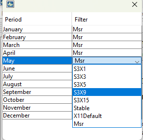 The seasonal filters can be selected for the entire series, or for a particular month or quarter.
