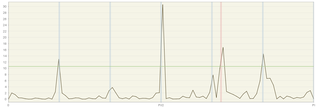 \[ \frac{ 2I(\pi/6)+ 2I(\pi/3)+ 2I(2\pi/3)+ 2I(5\pi/6)+ \delta I(\pi)}{\|\mathbf{X}-P_{\bar{sp}_{\{ e_0,c_{1},s_{1},c_{2},s_{2},c_{3},s_{3},c_{4},s_{4},c_{5},s_{5}, \delta e_{n/2}\}}} \mathbf{X}\|^2} \frac{n-12}{11} \sim F(11-\delta,n-12+\delta) \]