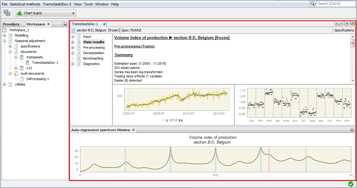 The blank zone in the figure above (on the right of the view) is the location where JDemetra+ displays various windows. More than one window can be displayed at the same time. Windows can overlap with each other with the foremost window being the one in focus or active. The active window has a darkened title bar. The windows in the results panel can be arranged in many different ways, depending on the user’s needs. The example below shows one of the possible views of this panel. The results of the user’s analysis are displayed in an accompanying window. The picture below shows two panels – a window containing seasonal adjustment results (upper panel) and another one containing an autoregressive spectrum (lower panel).