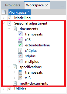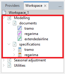 In the modelling section, you can create documents based on the reg-ARIMA or Tramo only specification (which are the same as the ones used for the pre-treatment phase of seasonal adjustment with X-13-ARIMA (Reg-ARIMA) and Tramo-Seats (Tramo) and thus described in the SA chapter).