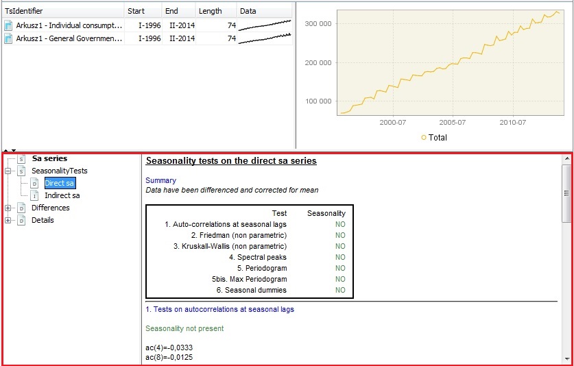 The bottom panel presents the detailed results. The seasonality test node presents the outcome of the seasonality tests performed for the aggregated series adjusted directly (Direct sa) and indirectly (Indirect sa). The reason for presenting these tests here is that the presence of residual seasonality and calendar effects should be monitored, especially in the indirectly adjusted series (see (guidelines2015?)). It might happen that the seasonality is successfully removed from the components but it is still present in the aggregated series.
