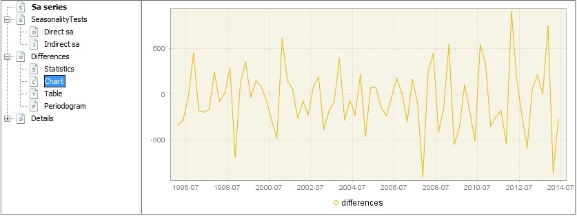 The Differences node presents selected different results between the direct and the indirect seasonal adjustment approaches. The Statistics section shows basic statistics (average, standard deviation, minimum and maximum) for the relative differences (%) between the direct and the indirect SA series. Chart contains the graph of the differences, while Table includes the actual values. The Periodogram section presents graphs for two spectral estimators – the periodogram and the auto-regressive spectrum.