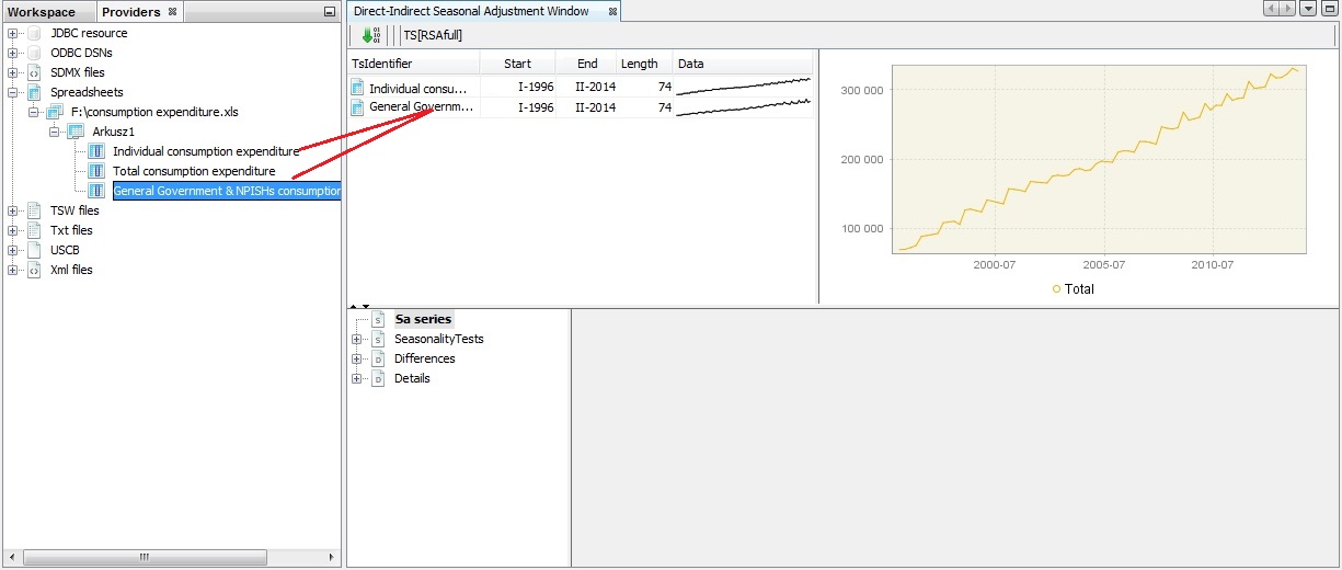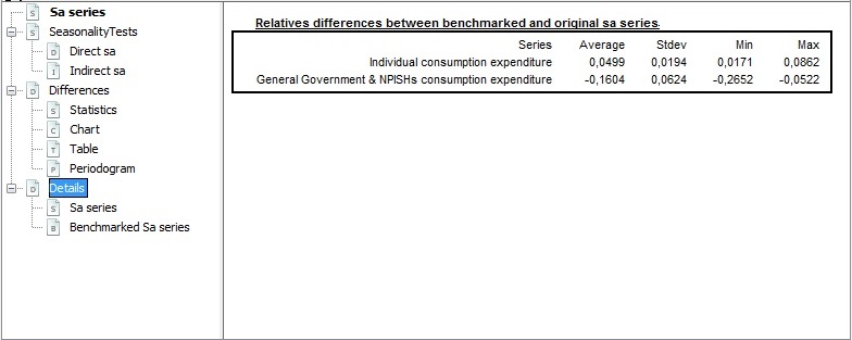 The Details node include the basic statistics for the relative differences between the benchmarked and original series as well as the actual time series adjusted directly (Sa series) and indirectly (Benchmarked Sa series).