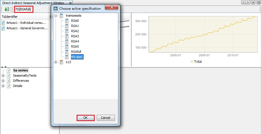 By default, the pre-defined Tramo-Seats specification is used (RSAfull) for seasonal adjustment of a dataset. To change it, click on the button marked in the picture below. This will provide you with the alternative specifications. Here the user defined specification named My spec is chosen.